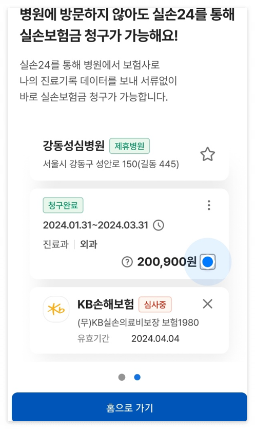 - 초기 설정이 완료되면 실손보험 조회, 청구 등의 다양한 서비스를 이용할 수 있습니다.